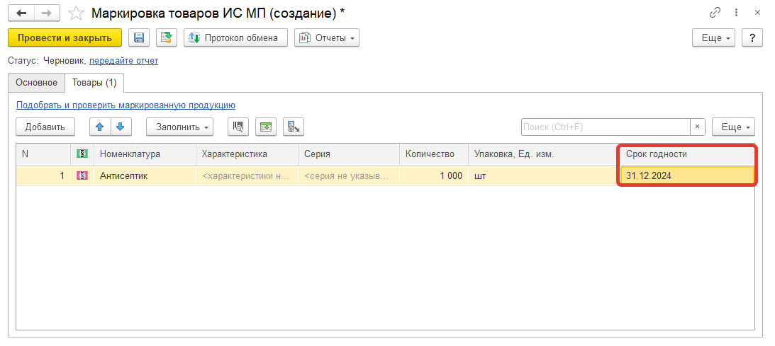 Документ Уточнение сведений о кодах маркировки ИС МП с видом операции Корректировка сведений о сроке годности применяется для товарных групп Антисептики, БАДы, Безалкогольное пиво, Медицинские изделия, Молоко и молочная продукция (без ВетИС), Упакованная вода для уточнения срока годности.