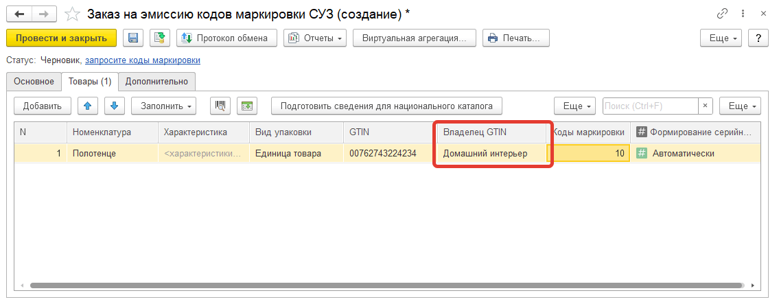 В документе Заказ на эмиссию кодов маркировки СУЗ с операцией Перемаркировка для участника оборота, не являющегося владельцем кода GTIN, реализована возможность указать код GTIN и его владельца (в ГИС МТ передается ИНН владельца) и получить коды для перемаркировки товаров. Такая возможность предусмотрена для товарных групп Товары легкой промышленности и одежда и Обувная продукция. При указании владельца GTIN - запрещено самостоятельное указание серийных номеров, доступно только автоматическое формирование.