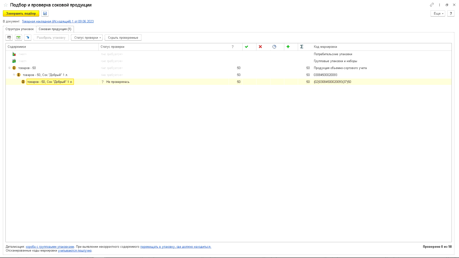 Реализована возможность использования объемно-сортового учета для товарной группы Соковая продукция. Доступны все операции работы с кодами объемно-сортового учета.