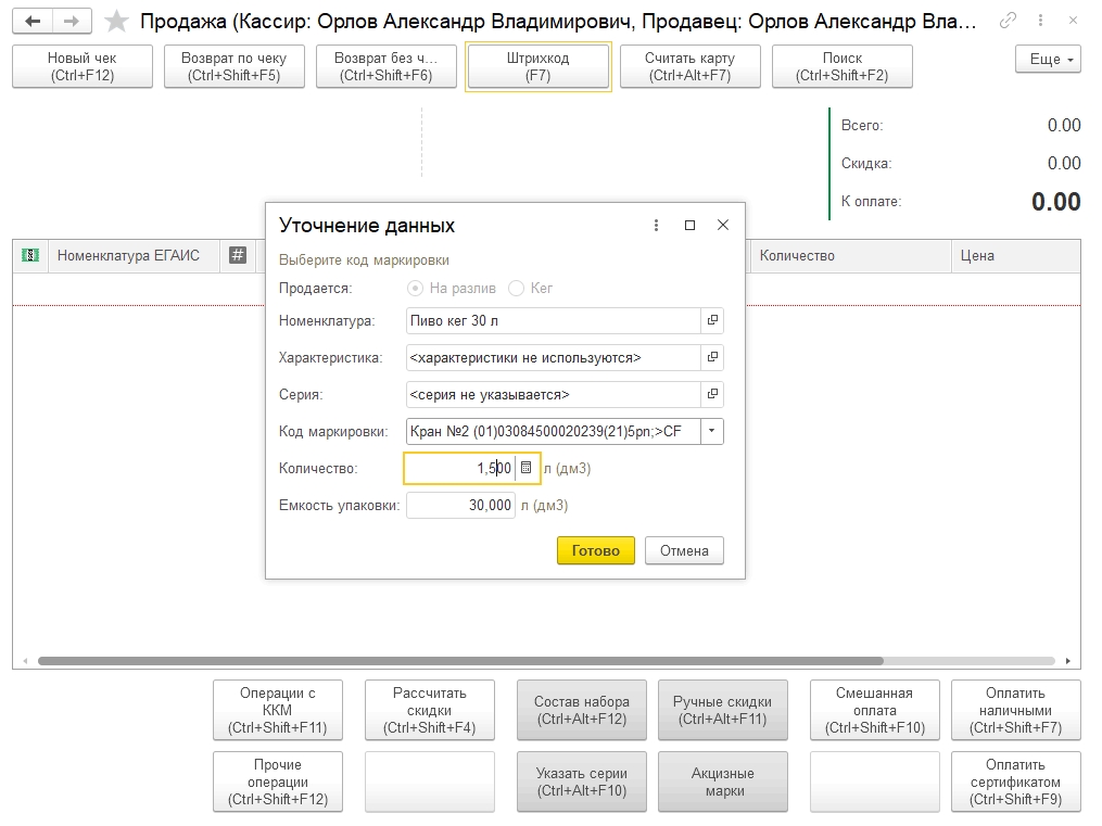 При сканировании кода GTIN (штрихкода EAN-13) отображается форма Уточнения данных, в которой нужно указать Код маркировки кега, а также Количество пива, продаваемого в розлив.
