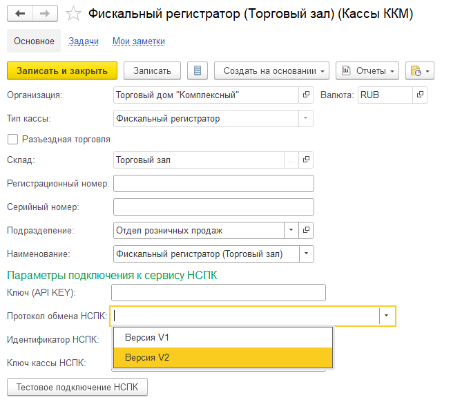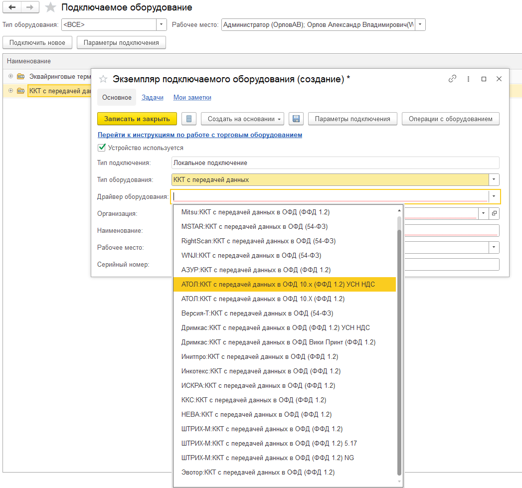 В списке подключаемого оборудования НСИ и администрирование – Администрирование – РМК и оборудование – Подключаемое оборудование необходимо создать новые экземпляры подключаемого оборудования с указанием нового драйвера. У новых драйверов, поставляемых в составе конфигурации, указано "УСН НДС".