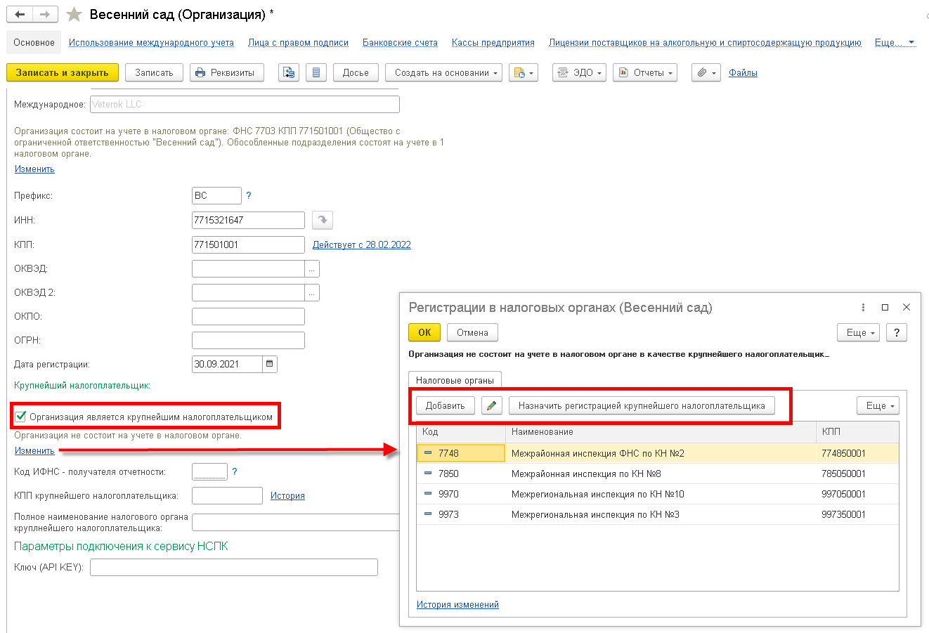 Если ранее была указана регистрация в качестве крупнейшего налогоплательщика в качестве основной, после обновления в карточки Организации заполняются новые реквизиты КПП крупнейшего налогоплательщика, и КПП по основной регистрации. Проверьте корректность заполнения реквизитов.