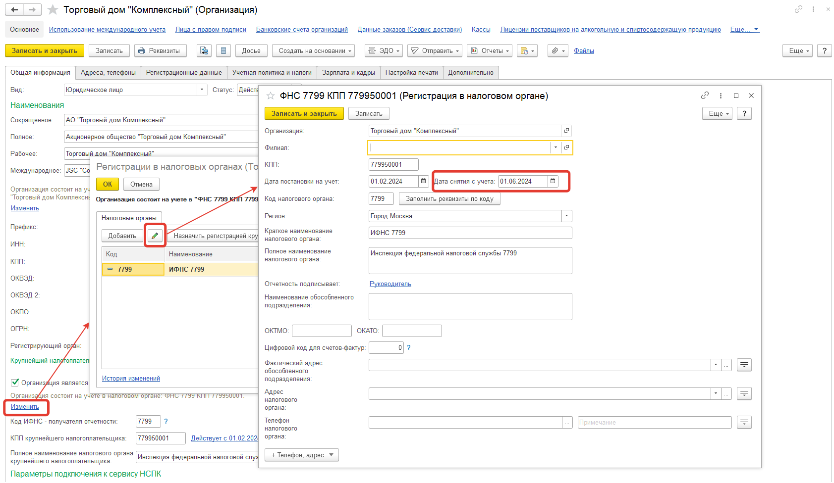 Дата снятия с учета в качестве крупнейшего налогоплательщика нужно в карточке регистрации в налоговом органе заполнить реквизит Дата снятия с учета.