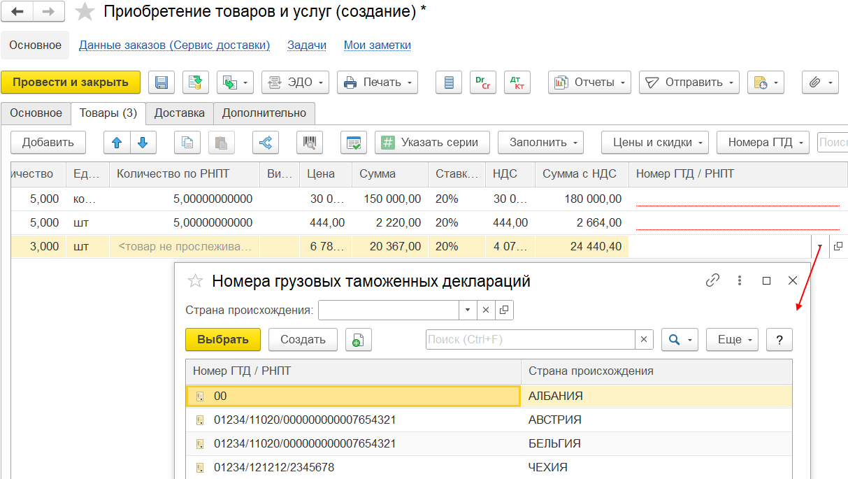 Создание и указание номера ГТД/РНПТ для импортных товаров