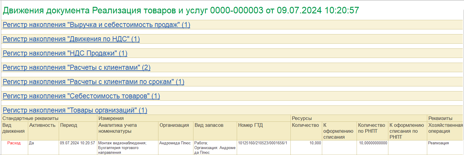 При проведении расходных накладных для подобранных работ аналогично товарам выполняется контроль остатков в регистре «Товары организаций». Если по прослеживаемой работе нет остатка РНПТ, при проведении документа списания будет выдано соответствующее сообщение. То есть прослеживаемые работы должны быть приобретены до реализации или выбытия из учета.