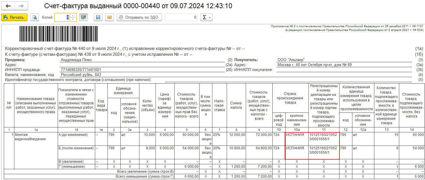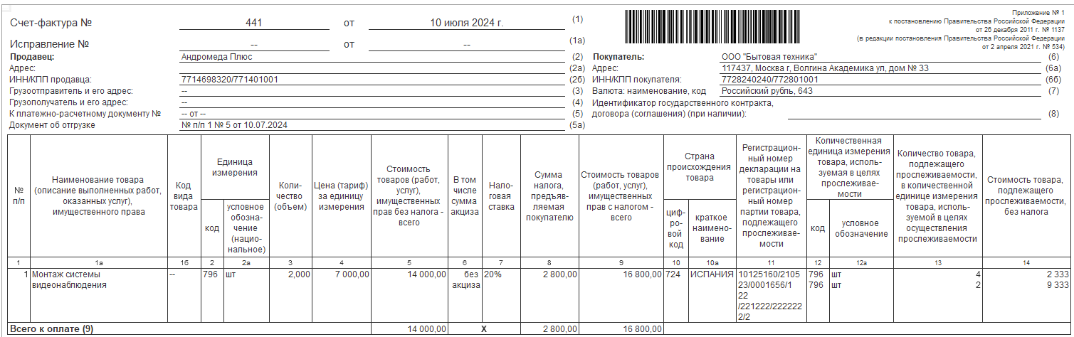 Например, исполнитель смонтировал заказчику систему видеонаблюдения, в которую входят прослеживаемые мониторы. Так как мониторы не реализуется отдельно заказчику, а передаются в составе выполненных работ, оформляется УПД/СФ, в котором необходимо заполнить реквизиты прослеживаемости в подстроках к строке с работой.