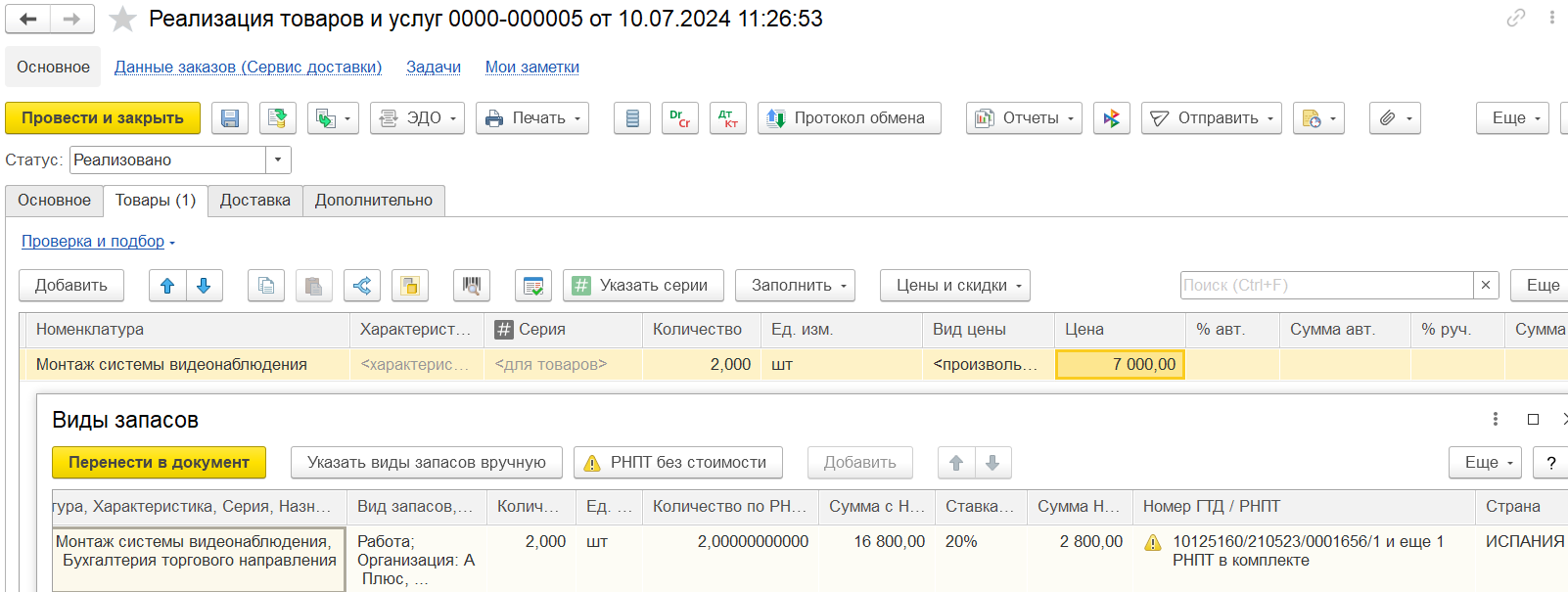 Для прослеживаемых работ, как и для товаров, заполняется табличная часть «Виды запасов» (доступна по команде «Еще – Открыть виды запасов» на форме накладной).