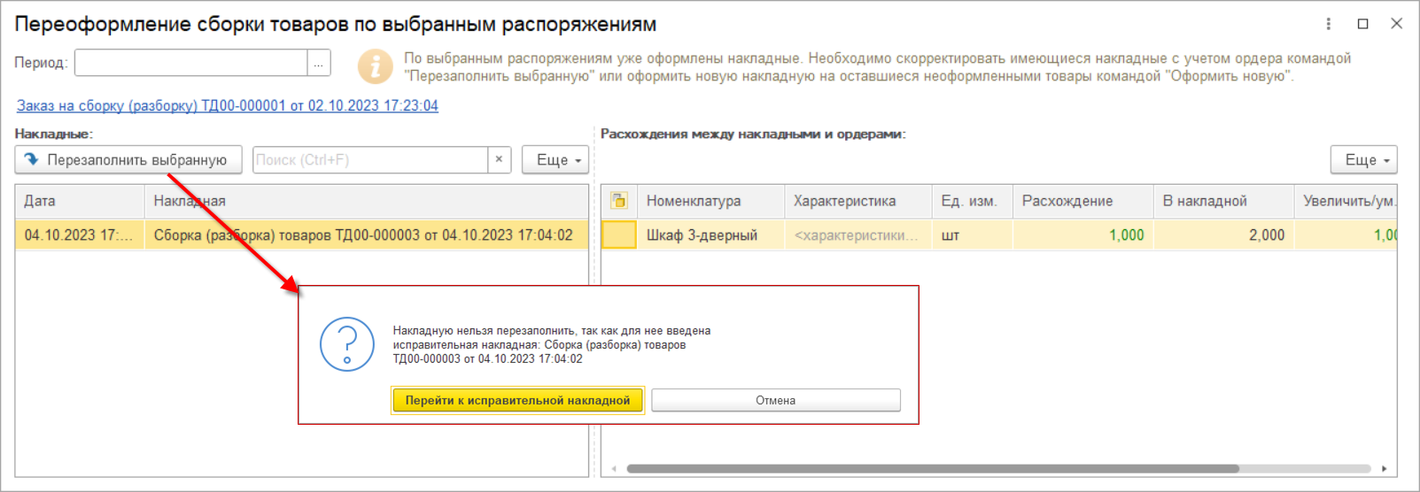 По заказам с измененным основанием необходимо принять решение: перезаполнить товары в заказе на доставку или игнорировать изменения.