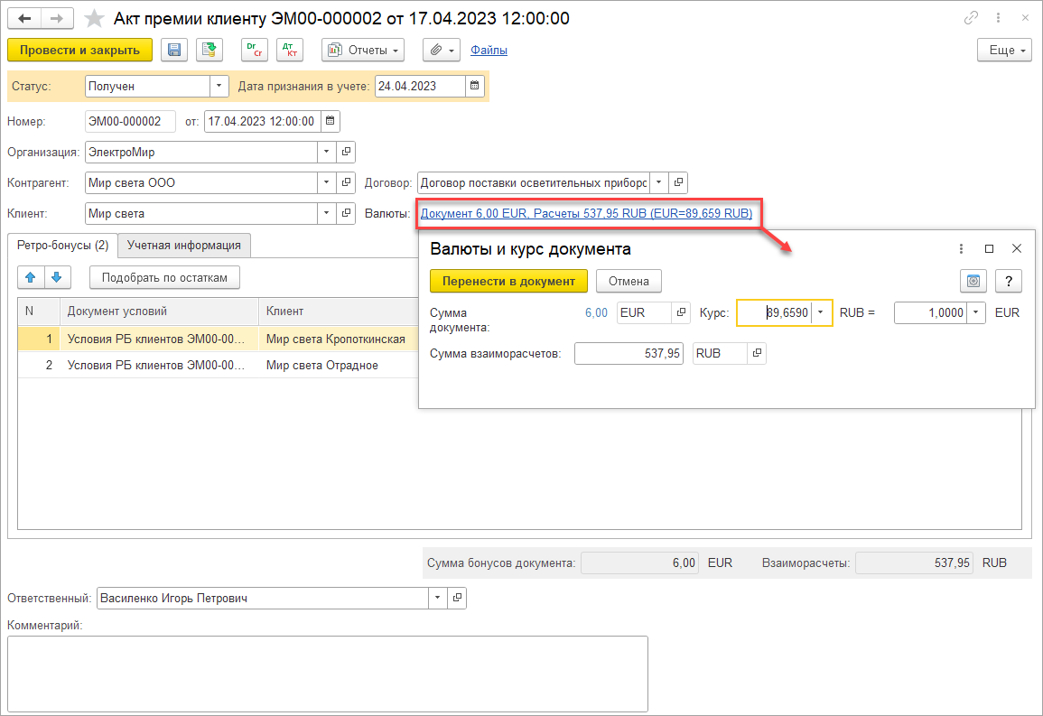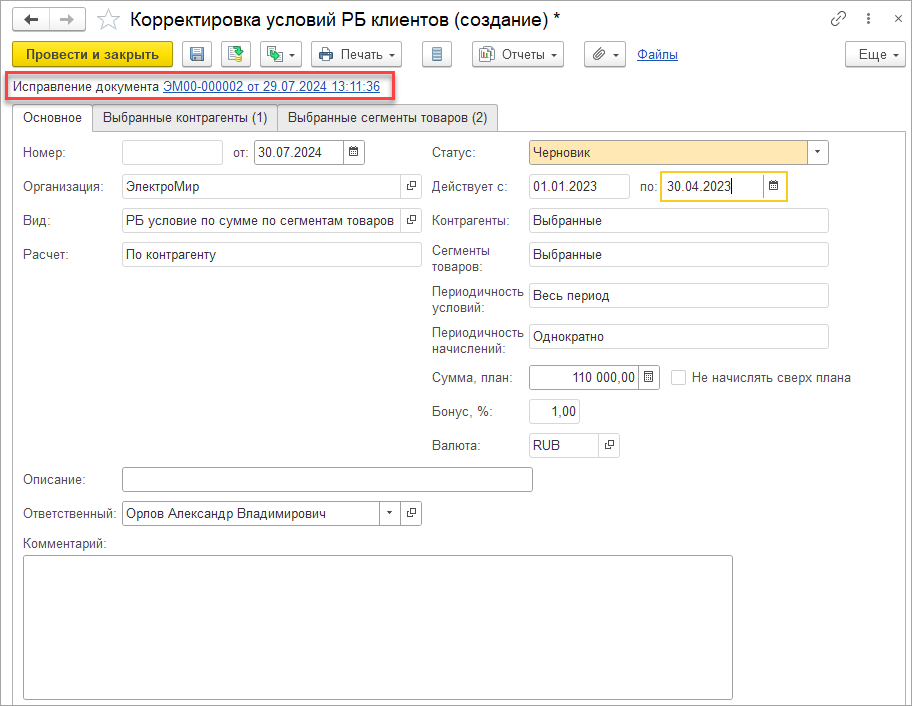 Для возвратов возможно интерактивное формирование либо документа Корректировка реализации, либо Возврат товаров от покупателя. Дата документа – дата приема возврата складом или сортировочным центром. По частичным возвратам реализация признается в полном объеме, а на возвращаемые товары создается документ возврата (или корректировки).
