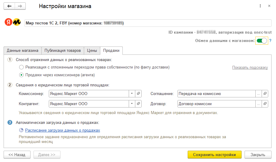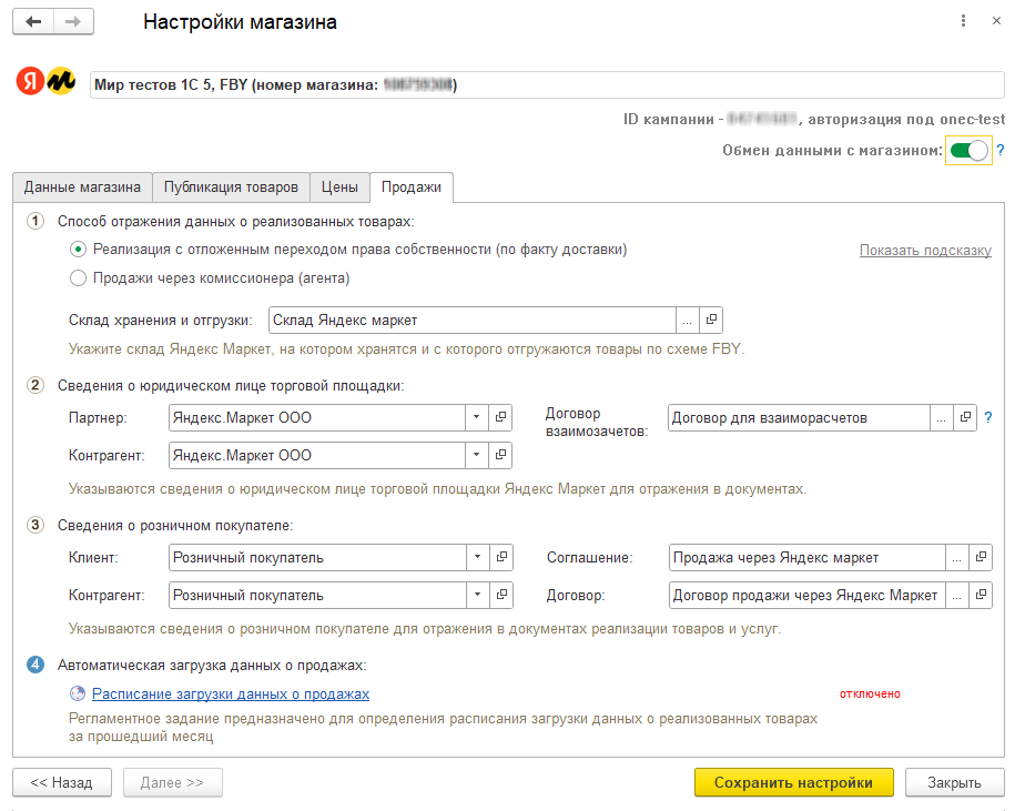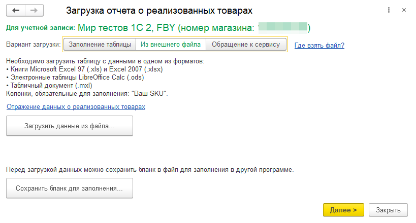 Для загрузки данных о реализованных товарах интеграционными методами требуется указать только период.
