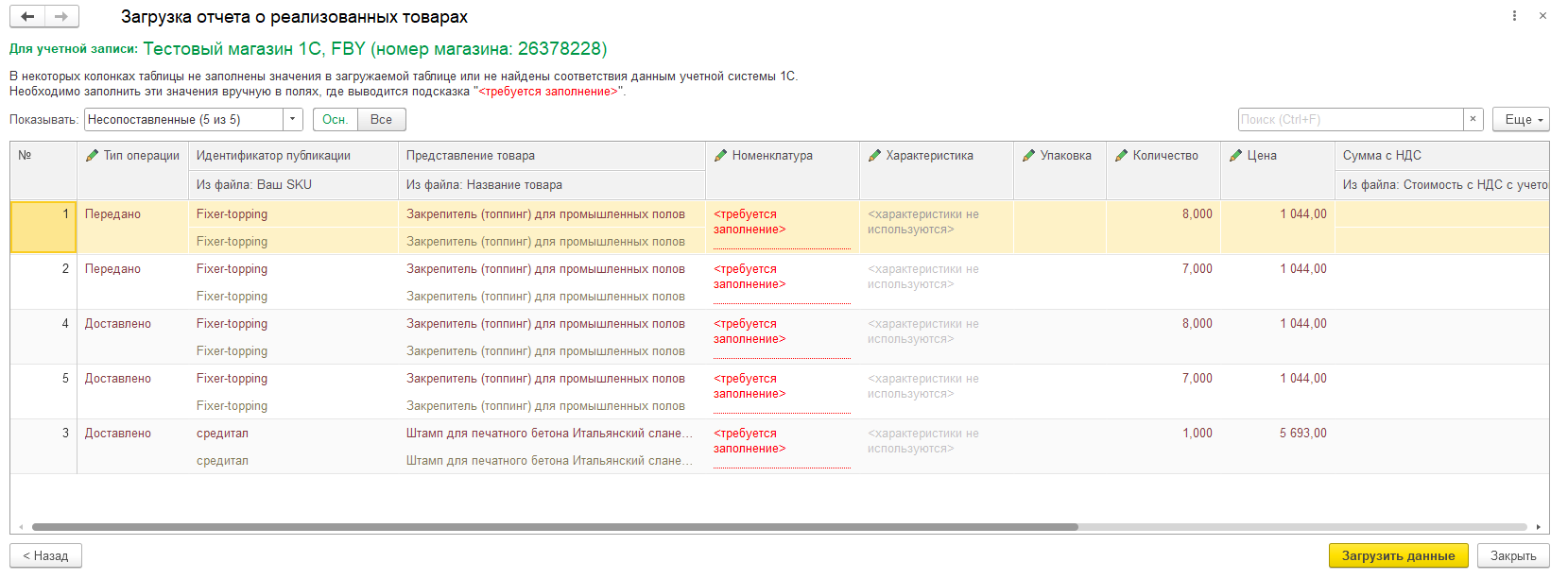 Если после заполнения таблицы или загрузки файла данными торговой площадки не удастся автоматически их сопоставить с данными учетной системы, или если не заполнены обязательные реквизиты, то отображается таблица для дозаполнения обязательных значений.