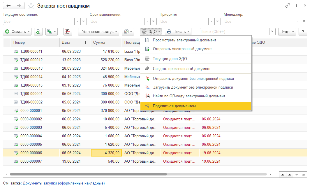 Команда выгрузки документов в сервис 1С:Share предусмотрена в меню ЭДО в формах документов и формах списков документов Заказ поставщику, Заказ клиенту и Счет на оплату клиенту.