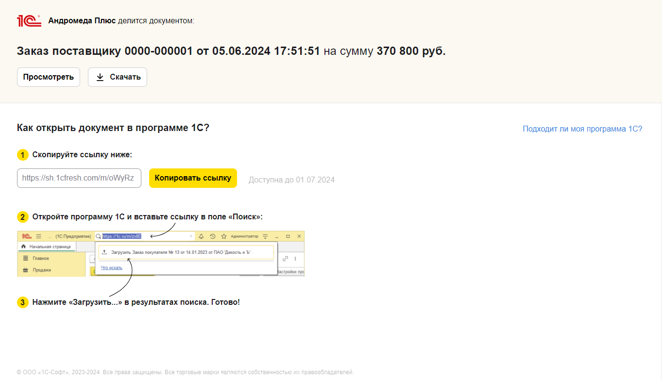 В случае использования глобального поиска в поле поиска нужно ввести полученную короткую ссылку от отправителя. В результатах поиска выводится команда перехода к предпросмотру документа в веб-интерфейсе сервиса и команда Загрузить…. При выполнении этой команды происходит создание документа в информационной базе.