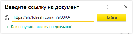 При выборе команды Загрузить документ по ссылке в разделах командного интерфейса Закупки или Продажи открывается форма, в которую нужно вставить ссылку и выполнить команду Найти.