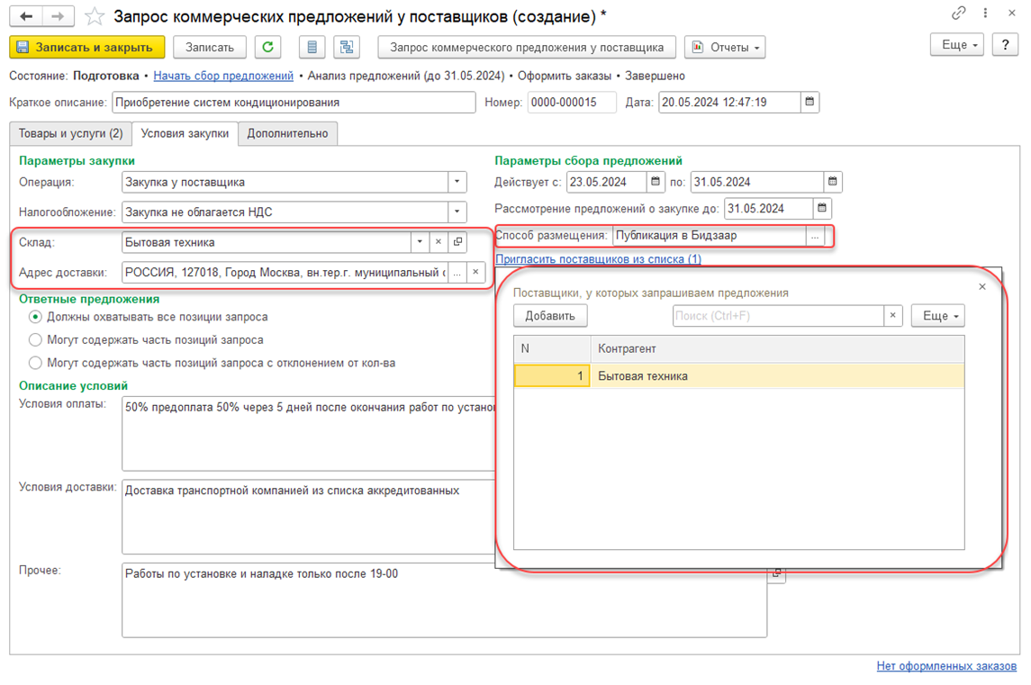Для публикации запроса коммерческих предложений необходимо создать документ Запросы коммерческих предложений у поставщиков со способом размещения Публикация в Бидзаар (указывается на закладке Условия закупки), в котором указываются товары (услуги) для закупки и адрес поставки.