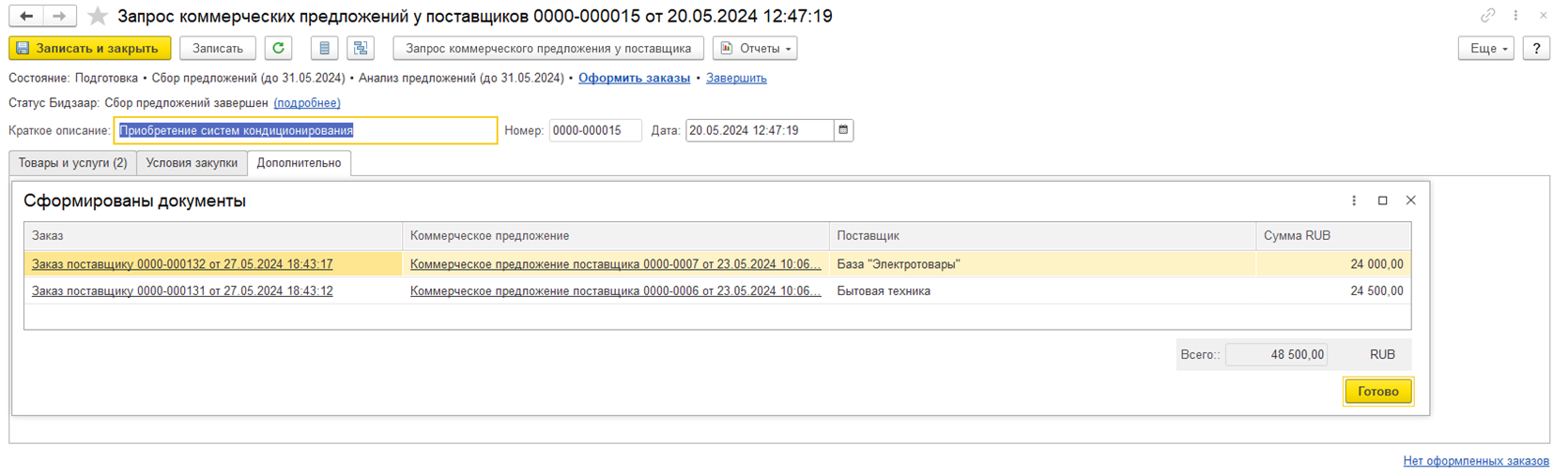 Итого закупок загружаются в информационную базу командой Оформить заказы, которая доступна когда состояние запроса закупки в Бидзаар будет Завершен или Отменен.