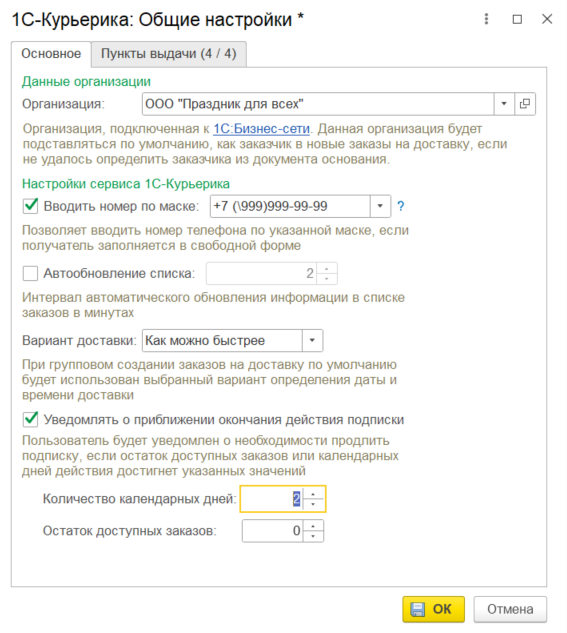 В форме настроек указывается Вариант доставки (Как можно скорее или Выбрать дату), который будет использоваться по умолчанию. Также можно настроить Уведомление о приближении окончании действия подписки на сервис 1С-Курьерика для обеспечения бесперебойной работы службы доставки. При включении такой возможности задаются пограничные значения, при которых оно выводится. При приближении окончания действия подписки на сервис 1С-Курьерика уведомление будет выводиться в информационной строке в верхней части формы списка заказов.