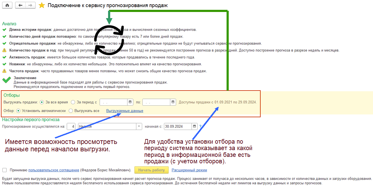 После принятия пользовательского соглашения и применения команды «Начать работу» будет рекомендовано перейти в рабочее место Сервис прогнозирования продаж по соответствующей гиперссылке.