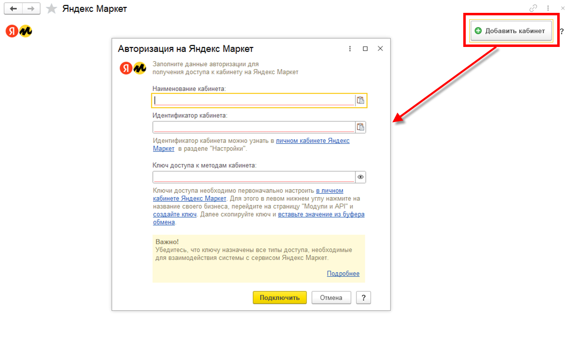 Для подключения к кабинету указываются: