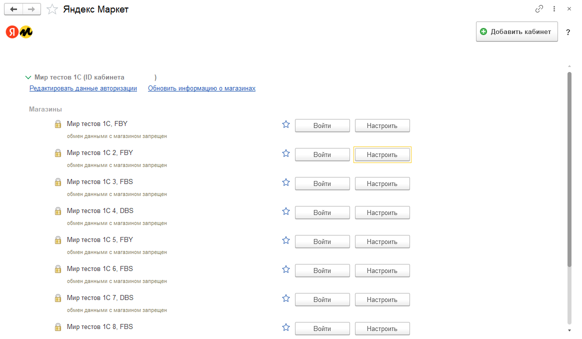 После подключения кабинета в информационной базе будет доступен список магазинов, связанных с этим кабинетом.