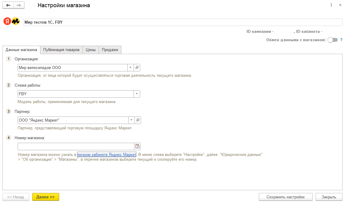 В форме Настройки магазина на закладке Данные магазина удален реквизит Идентификатор кабинета, который теперь задается в форме подключения как описано выше. Для реквизита Номер магазина предусмотрена кнопка вставки из буфера.