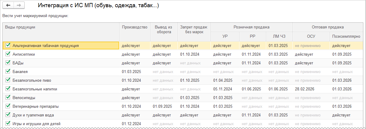 По гиперссылке Виды продукции открывается окно со списком учитываемых товарных групп, поддерживающих локальную проверку разрешительного режима, по которым будет выполняться проверка в рамках этой настройки.