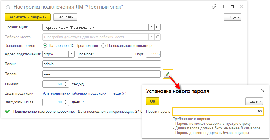 По кнопке Изменить (пиктограмма в виде карандаша) рядом с полем Пароль можно изменить стандартный пароль Администратора, заданный при установке Локального модуля «Честный знак». Новый пароль при установке должен отвечать внутренним условиям проверки на сложность.