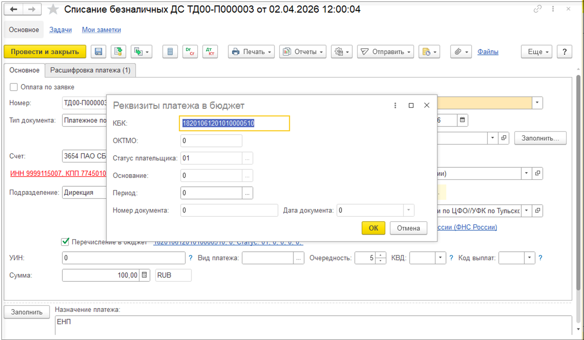 - Для платежей в бюджет всегда проверяется наличие