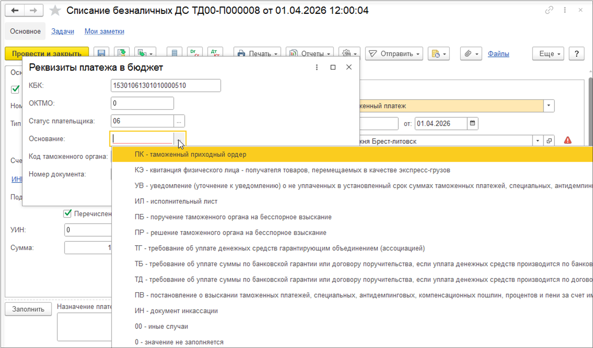 - Обновлены основания платежа для таможенных