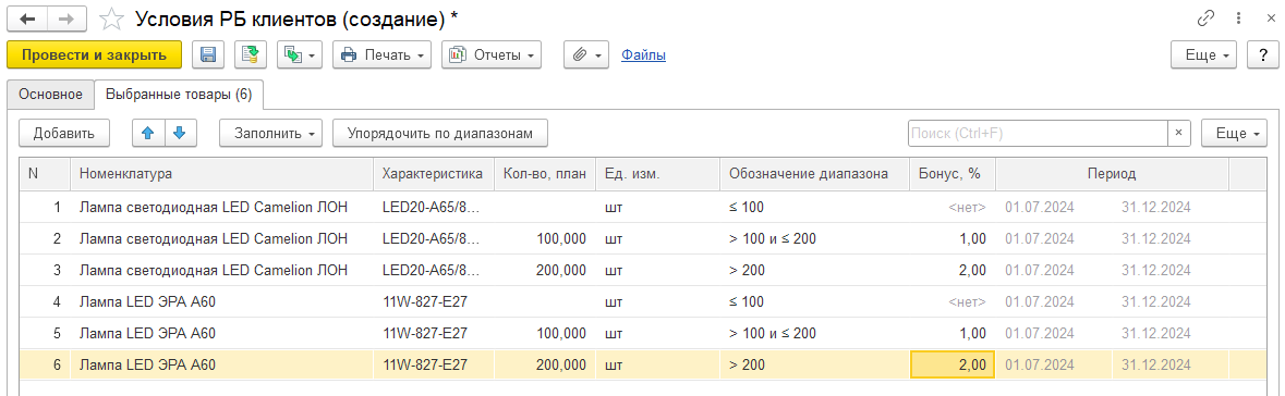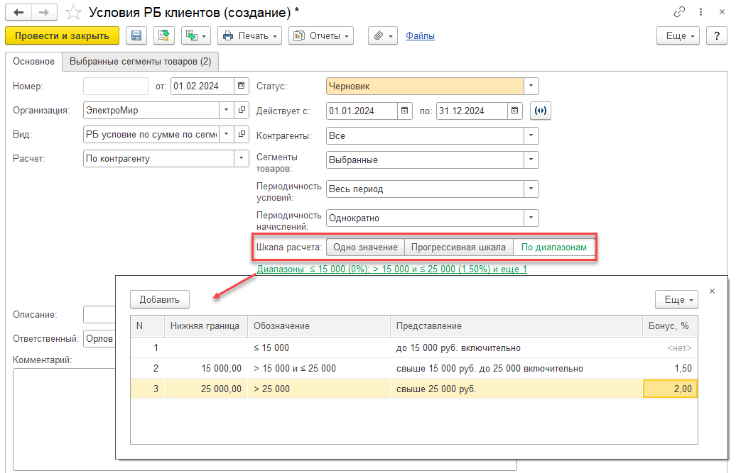 Реализован расчет бонусов по количеству и сумме, настроенным прогрессивной шкалой или по диапазонам.