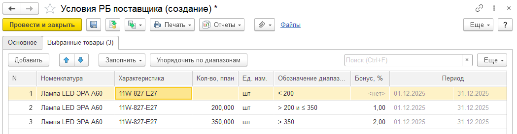 Для каждой строки данных закупок: Бонус = Расчётная база * % бонуса, где % бонуса определяется достигнутым значением плана. Выполняется корректировка погрешности расчета: ■ Рассчитывается общий итоговый бонус как Плановое количество * Общая фактическая сумма закупок * % бонуса / Фактическое количество ■ Разница между общим итоговым бонусом и суммой бонусов по документам относится на последнюю строку с неотрицательным количеством. |