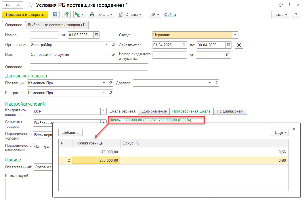 Проверка выполнения клиентом условий продаж осуществляется отдельно для каждой позиции в каждом периоде расчета и зависит от настройки Шкала расчета в документе условий:
