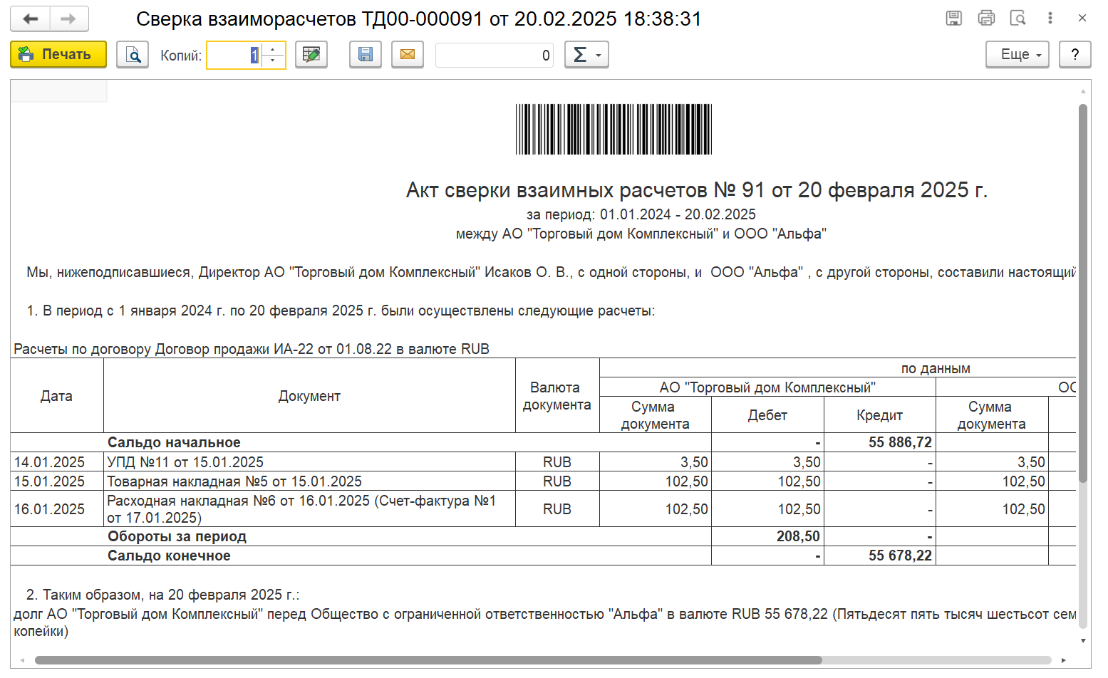 Основные печатные формы – первичные документы по хозяйственной операции (УПД, ТОРГ-12, Акт и др.). Данные формы являются основанием для отражения в финансовом учете, фиксируют переход права собственности, выводятся в актах сверки. В частности это могут быть следующие формы документов: