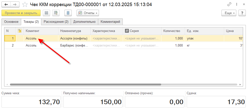 Для фиксации, согласования и отработки расхождений, выявленных после передачи товаров от комитента комиссионеру, предназначен документ Акт о расхождениях после передачи с типом операции Передача на комиссию.