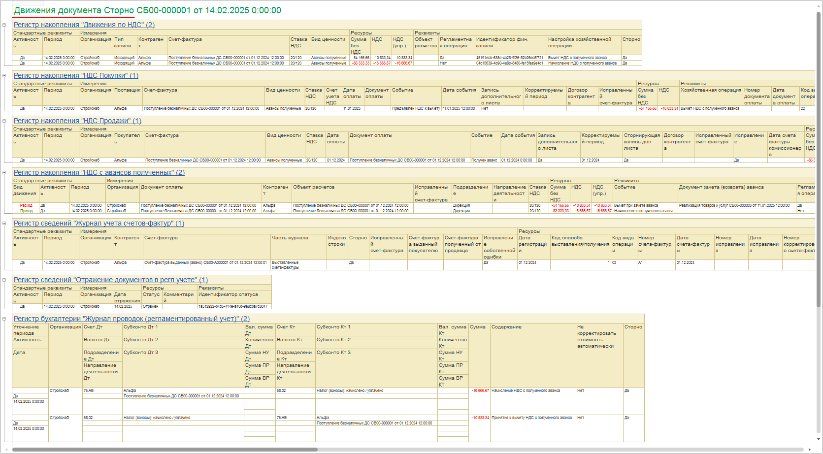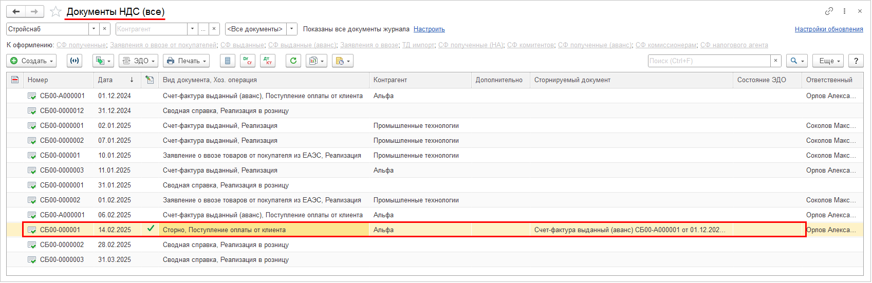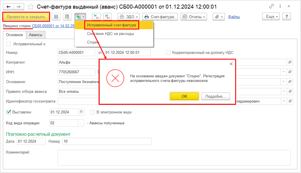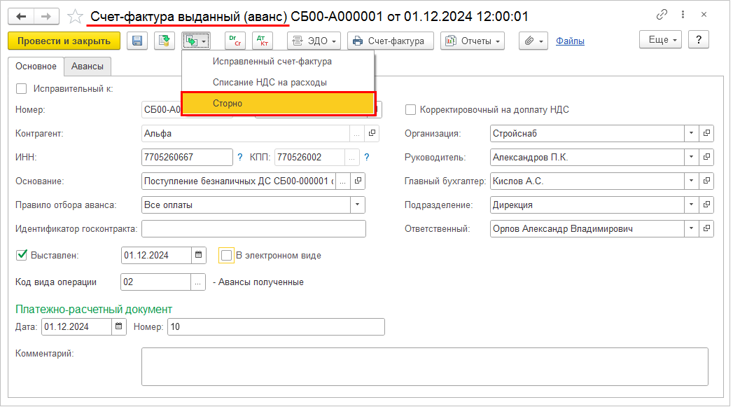 Сторнирование документа Счет-фактура выданный (аванс) не запускает автоматически процесс аннулирования документа в ЭДО. Необходимо вручную запустить процесс аннулирования счета-фактуры в ЭДО или связаться с контрагентом другим способом и уведомить его об аннулировании.