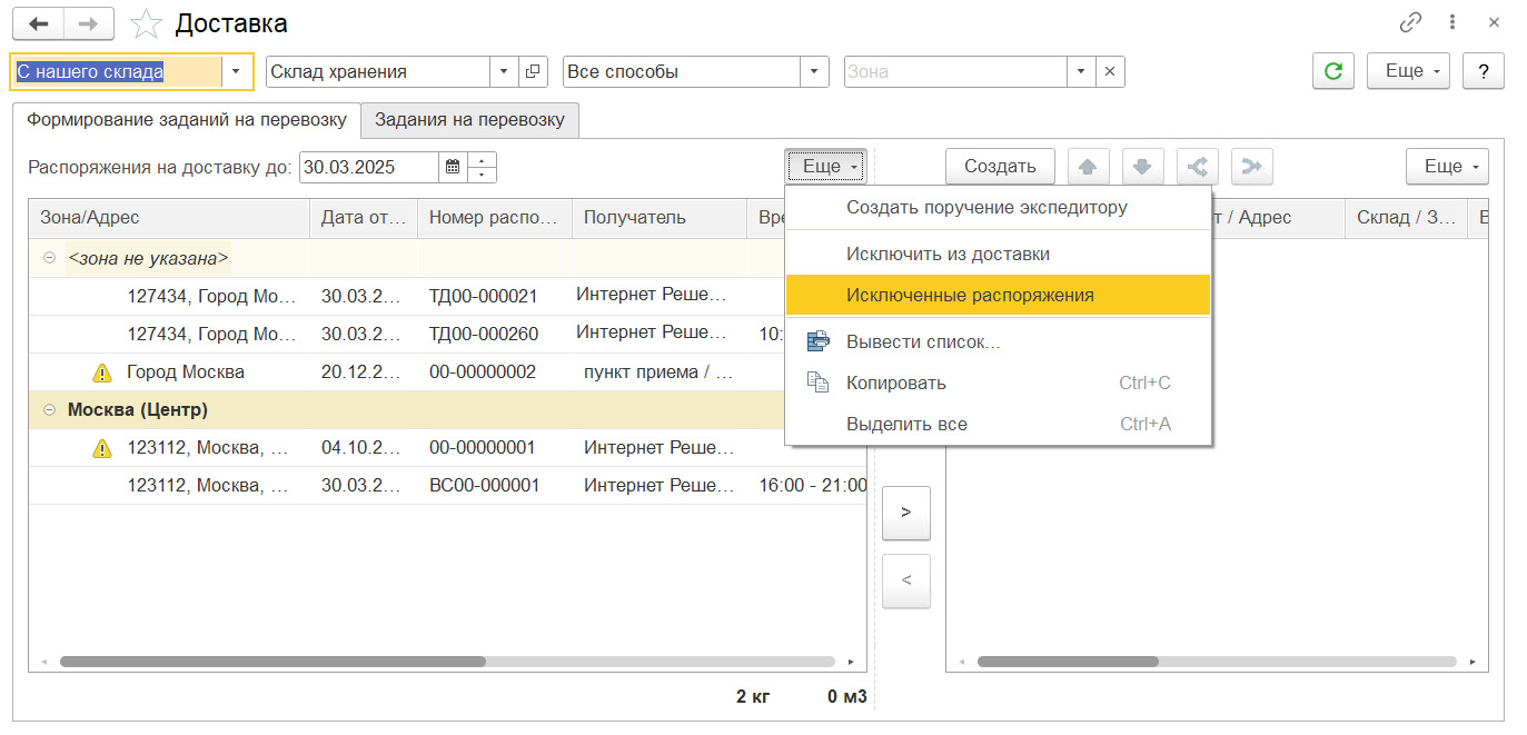 Исключенные из планирования доставки заказы доступны к просмотру из рабочего места управления доставкой. Исключение из доставки отменится автоматически после формирования и подтверждения отгрузки из учетной системы. Также возможна отмена по команде из списка исключений в рабочем месте Доставка.