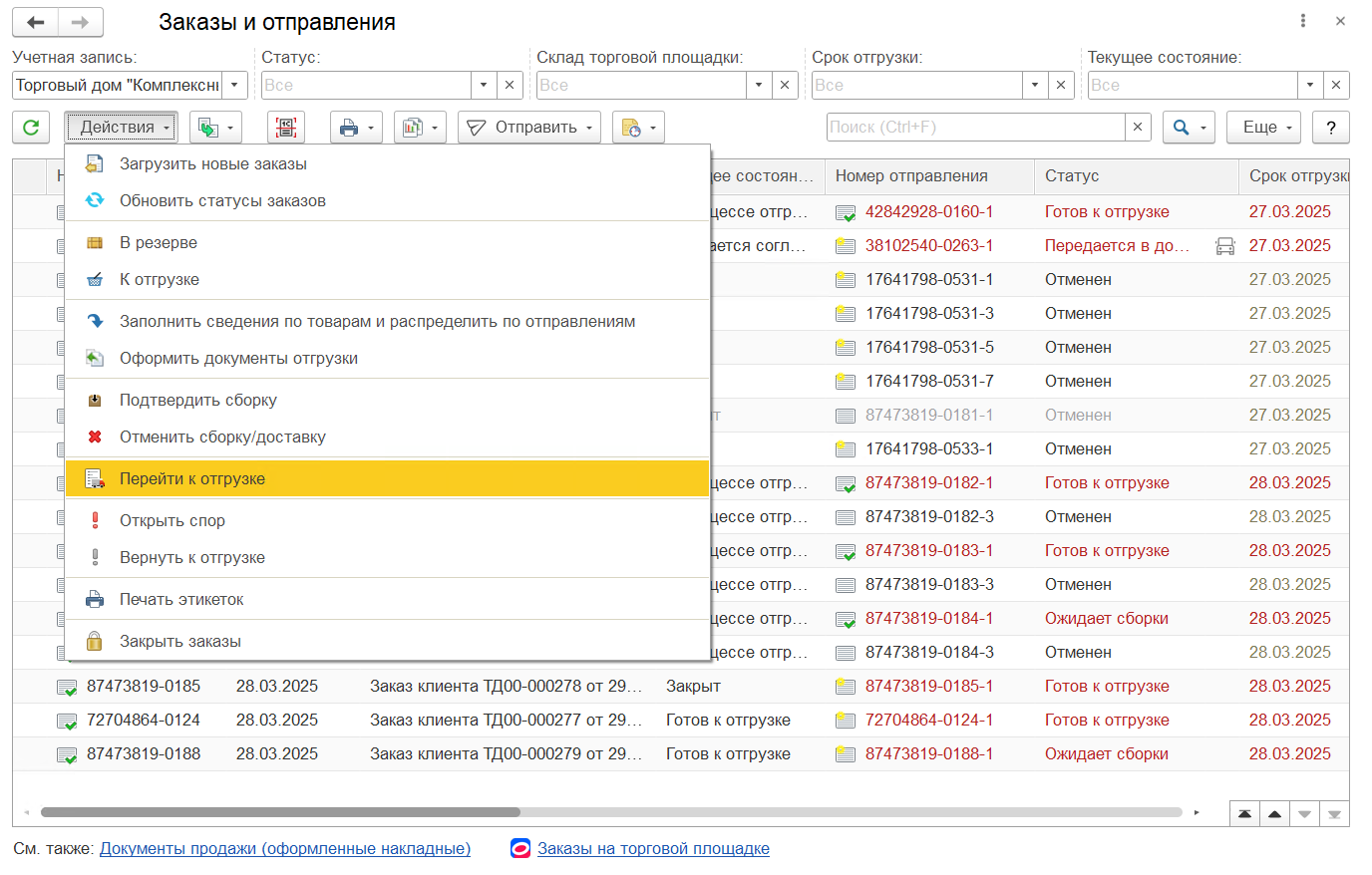 В меню Действия также возможны обновление статусов отправлений отгрузки, перевод заказов в состояние отгрузки на складе, заполнение сведений по товарам и оформление документов отгрузки для отправлений.