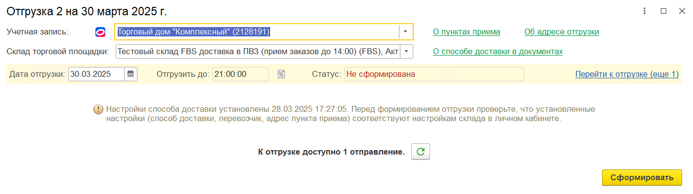 ■ Перед формированием отгрузки проверяется адрес пункта приема и его загруженность. При необходимости изменяется пункт приема в личном кабинете. Эти изменения дублируются для склада в учетной системе (из настроек обмена в разделе «Обновление остатков товаров» или из формы работы с отгрузкой).