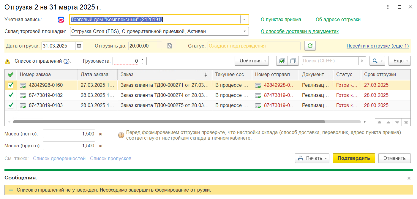 Для сформированной отгрузки можно отредактировать состав отправлений. При доверительной приемке на складе нужно указать количество грузовых мест. Сформированная отгрузка требует подтверждения состава отправлений, передаваемых в доставку (команда Подтвердить). Неподтвержденную отгрузку можно отменить (команда Отменить).