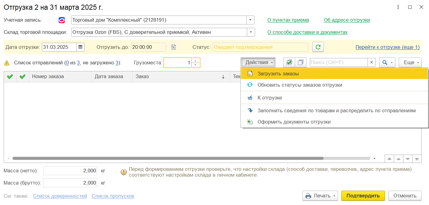 Если по данным торговой площадки на момент формирования отгрузки есть отправления, которые не загружены в учетную систему, выводится соответствующая информация в строки Список отправлений… и доступна команда Загрузить заказы в меню Действия. Если есть хотя бы одно загруженное отправление, при подтверждении отгрузки автоматически исключаются все незагруженные отправления аналогично исключенным по инициативе пользователя. Если все отправления не загружены, при подтверждении отгрузки подтверждается полный состав отгрузки, предложенный площадкой.