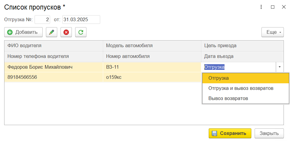 Также в нижней части формы отгрузки можно оформить Список пропусков. Для некоторых пунктов приема он может быть обязательным, тогда пользователь информируется об этом. Информация о пропусках не хранится в учетной системе – возможно чтение информации только в режиме онлайн с торговой площадки. Данные водителя можно ввести в поле ввода или выбрать из справочника Физические лица. Данные автомобиля можно ввести в поле ввода или выбрать из справочника Транспортные средства.
