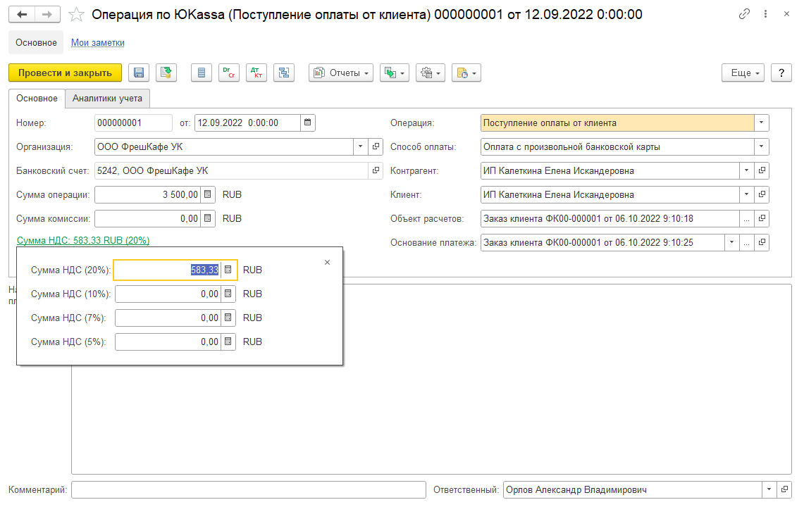 В документе Операция по ЮKassa поддержано указание сумм НДС по льготным ставкам 5% и 7%. Сумма НДС отображается на форме документа в виде гиперссылки. Суммы в разрезе ставок перечисляются через запятую, в скобках указывается ставка НДС. При нажатии на гиперссылку отображаются все поля сумм НДС по ставкам с указанием валюты.