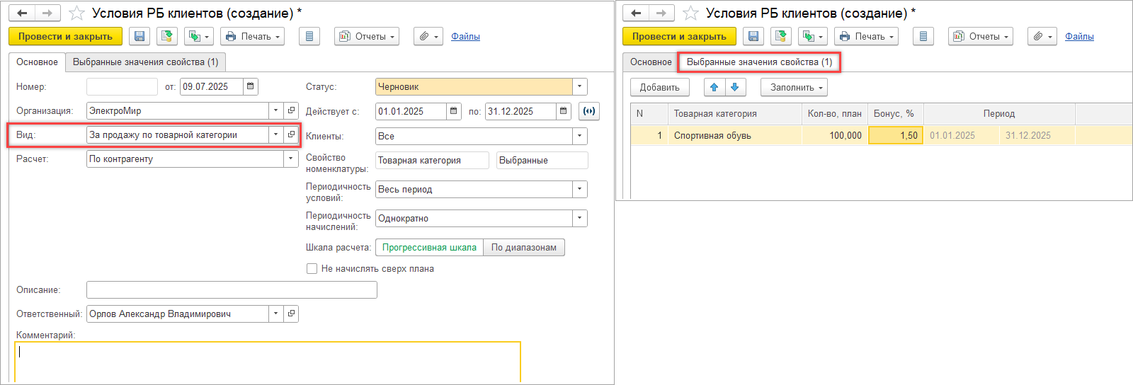 В документе Условия ретро-бонусов клиентов с настройкой товаров по свойствам на отдельной закладке указываются значения свойства номенклатуры. К выбору доступны значения свойства, выбранного в виде ретро-бонусов. Могут быть указаны через выбранные или исключённые значения.