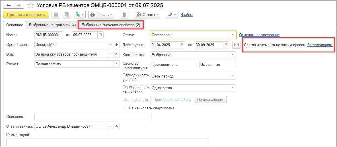 Фиксация состава документа доступна из формы документа Условия ретро-бонусов поставщика и Начисление ретро-бонусов поставщика. Фиксация состава документа разрешена только в случаях, если нет корректировки условий ретро-бонусов в статусе На согласовании.