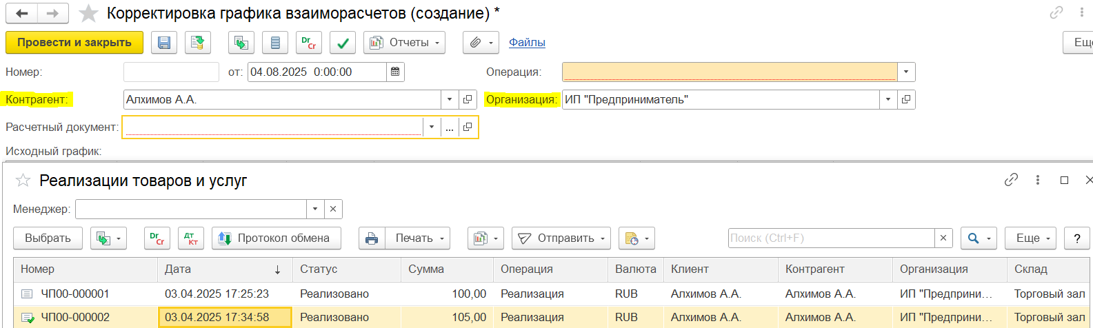 Документ доступен по ссылкам Продажи – Расчеты с клиентами – Корректировки графиков взаиморасчетов или Закупки – Расчеты с поставщиками - Корректировки графиков взаиморасчетов.