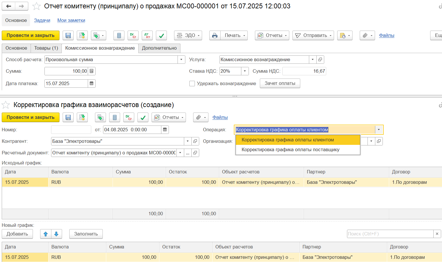 Доступность списка операций зависит от наличия у исходного документа движений расчетов. Если доступен только один тип операция, то в корректировке поле Операция блокируется, например, при выборе документа реализации товаров и услуг. Несколько значений операций доступно, например, при выборе в корректировке документа отчет комитенту (принципалу) о продажах, поскольку документ формирует как движения по расчетам с поставщиками, так и движения по расчетам с клиентами. В таком случае в корректировке вручную выбирается необходимая операция – корректировка графика оплаты клиентом (для корректировки графика оплат комиссионного вознаграждения комиссионеру), либо корректировка графика оплаты поставщику (для корректировки графика оплаты долга комиссионера поставщику/комитенту). Аналогичное поведение и для отчета комиссионера о продажах.