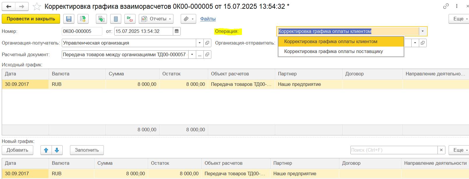 Для расчетного документа Передача товаров между организациями доступны на выбор несколько значений операции – корректировка графика оплаты клиентом и корректировка графика оплаты поставщику, поскольку документ формирует как движения по расчетам с клиентами, так и движения по расчетам с поставщиками.