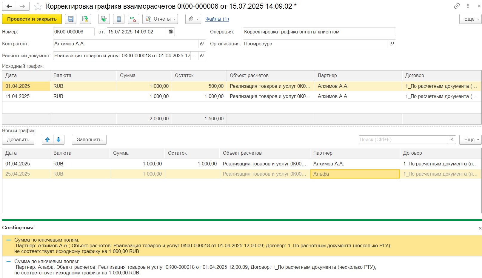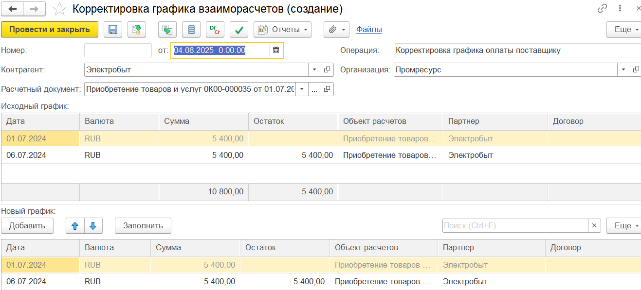 В табличную часть нового графика можно внести любой график, при этом итоговая сумма нового графика должна соответствует сумме исходного графика до корректировки. При проведении документа проверяется неизменность итоговой суммы взаиморасчетов по объектам расчетов (и полям аналитики учета по партнерам, партнеру, договору).