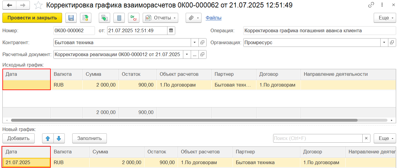 Если по исходному графику не предусмотрена дата погашения аванса, например, при корректировке реализации в случае восстановления аванса, то для аванса в исходном графике выводится пустая дата, а в новом графике по умолчанию устанавливается текущая дата, поскольку обязательна к заполнению для формирования нового графика.