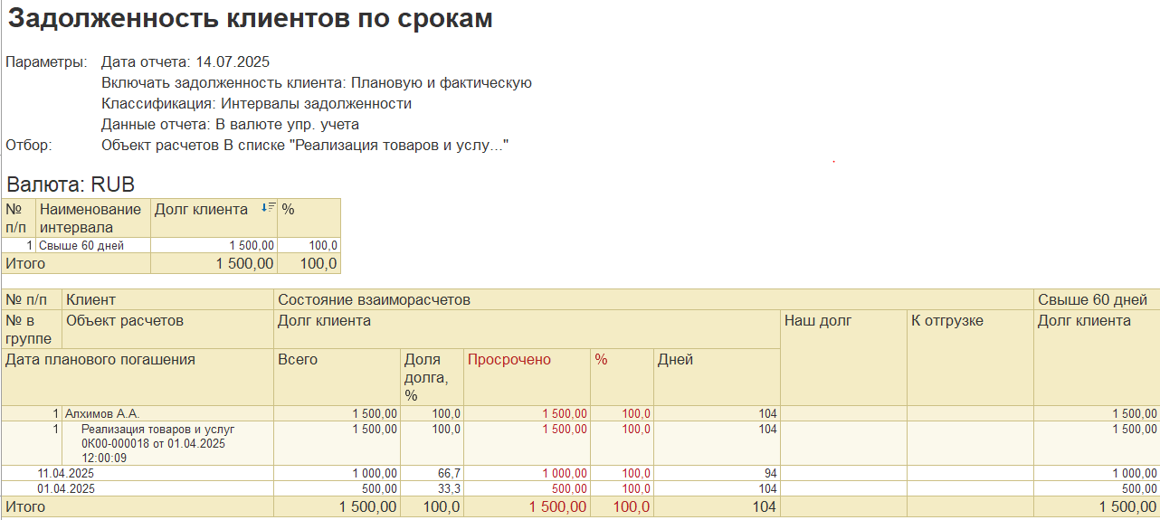 По состоянию на 14.07.25 видим просрочку по оплате реализации товаров и услуг от 01.04.25 с датами платежей 01.04.25 и 11.04.25.